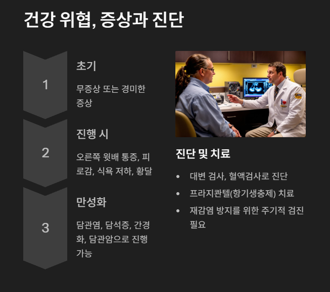 만성적으로 방치되면 담관염, 담석증, 간경화, 심지어 담관암으로 진행될 수도 있어 조기 발견과 치료가 중요합니다.