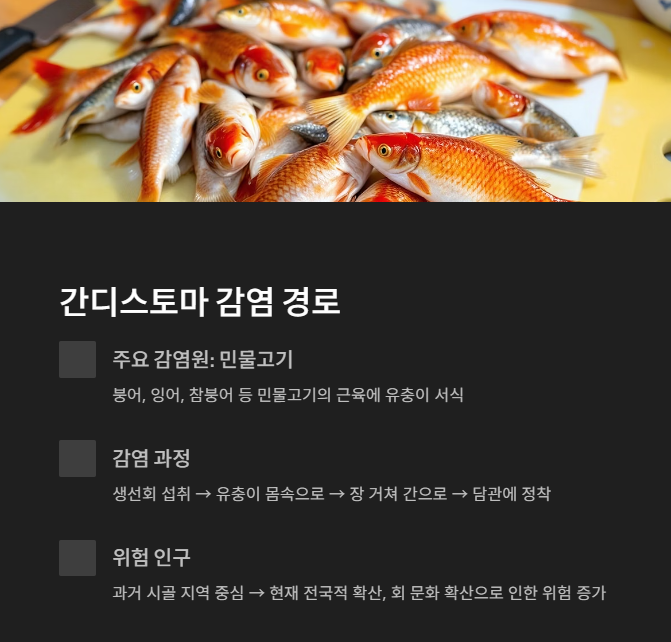 간디스토마는 주로 민물고기를 날로 섭취하면서 감염됩니다. 특히 붕어, 잉어, 참붕어 같은 민물고기에는 간흡충 유충이 서식하고 있죠. 이 유충은 물고기의 근육에 존재하다가 사람이 생선회를 먹을 때 몸속으로 들어오게 됩니다. 이후 장을 거쳐 간으로 이동해 담관에 자리 잡습니다.
