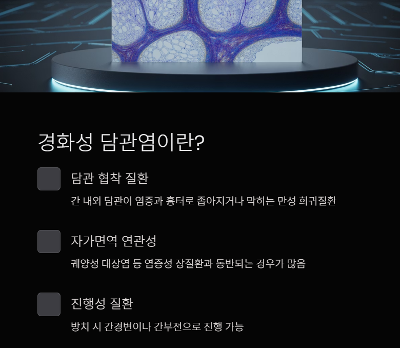 경화성 담관염(Primary Sclerosing Cholangitis, PSC)은 간 내외의 담관이 염증과 흉터로 인해 점차 좁아지거나 막히는 만성 희귀 질환입니다. 담즙이 제대로 배출되지 않으면 간 기능이 악화되고, 결국 간경변이나 간부전으로 이어질 수 있어 조기 진단이 매우 중요합니다. 자가면역 질환과 밀접한 관련이 있으며, 궤양성 대장염 등 염증성 장질환과 동반되는 경우가 많습니다.