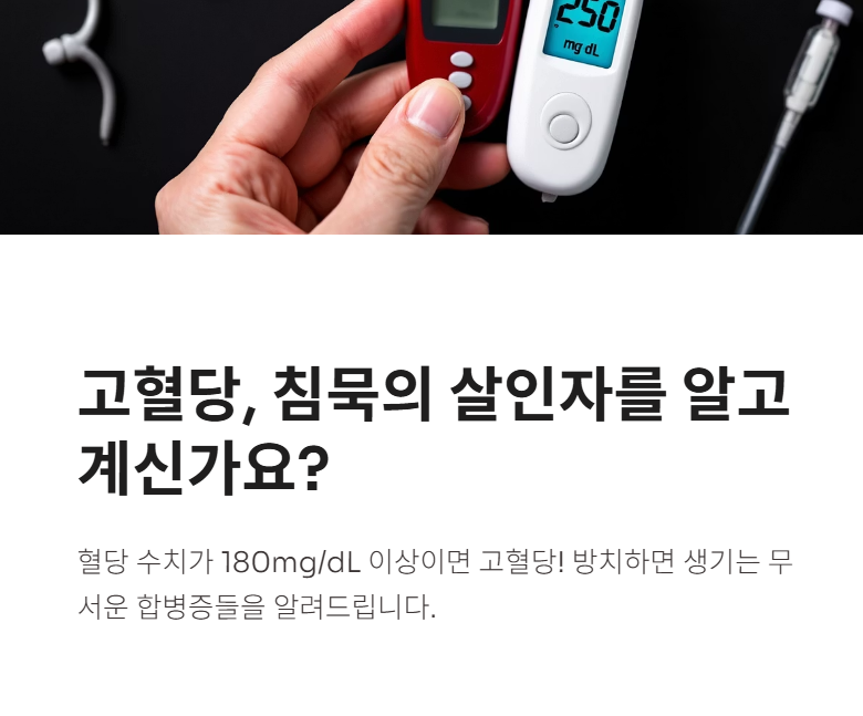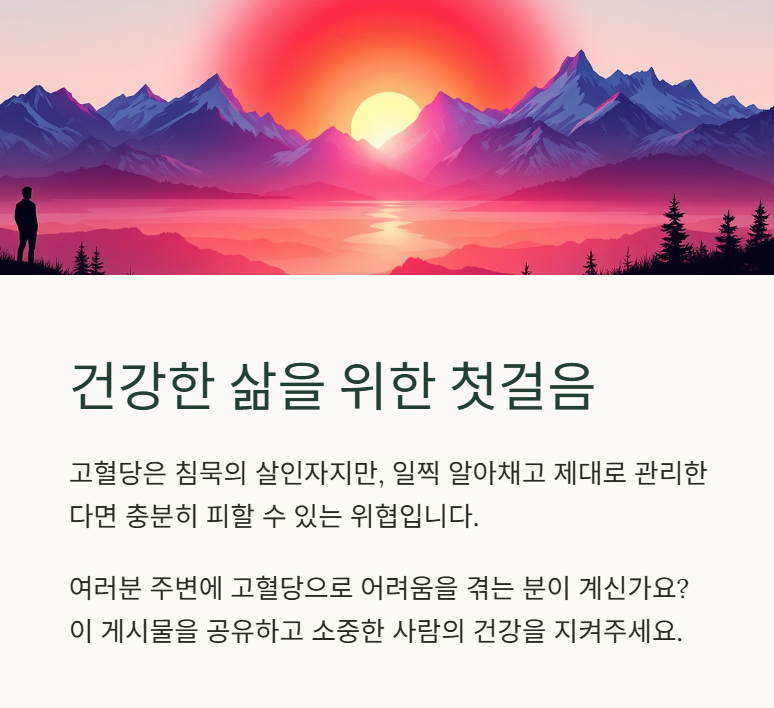 고혈당은 단순한 수치 이상이 아니라, 몸 속 깊은 곳에서 벌어지는 침묵의 살인자입니다. 하지만 일찍 알아채고, 제대로 관리한다면 충분히 피할 수 있는 위협입니다. 여러분의 건강, 오늘부터 조금씩 지켜보세요.