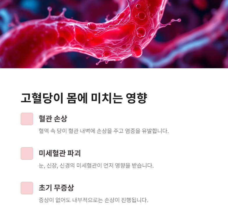 고혈당이 계속되면 우리 몸의 혈관이 먼저 망가지기 시작합니다. 혈액 속 당이 혈관 내벽에 손상을 주고, 염증과 산화 스트레스를 유발해 혈류 장애를 일으킵니다. 특히 미세혈관(눈, 신장, 신경 등)이 먼저 영향을 받기 때문에 초기엔 별 증상이 없어도 내부적으로는 진행되고 있는 경우가 많습니다. 이러한 변화가 시간이 지나면서 합병증으로 이어지게 됩니다.