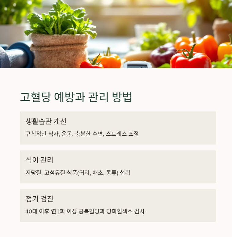다행히 고혈당은 철저한 관리로 예방하거나 늦출 수 있습니다. 규칙적인 식사, 운동, 충분한 수면, 스트레스 조절 등은 기본이죠. 여기에 자기 혈당을 꾸준히 모니터링하고, 정기 검진을 받는 것이 매우 중요합니다. 특히 40대 이후에는 연 1회 이상 공복혈당과 당화혈색소(HbA1c) 검사를 권장합니다.