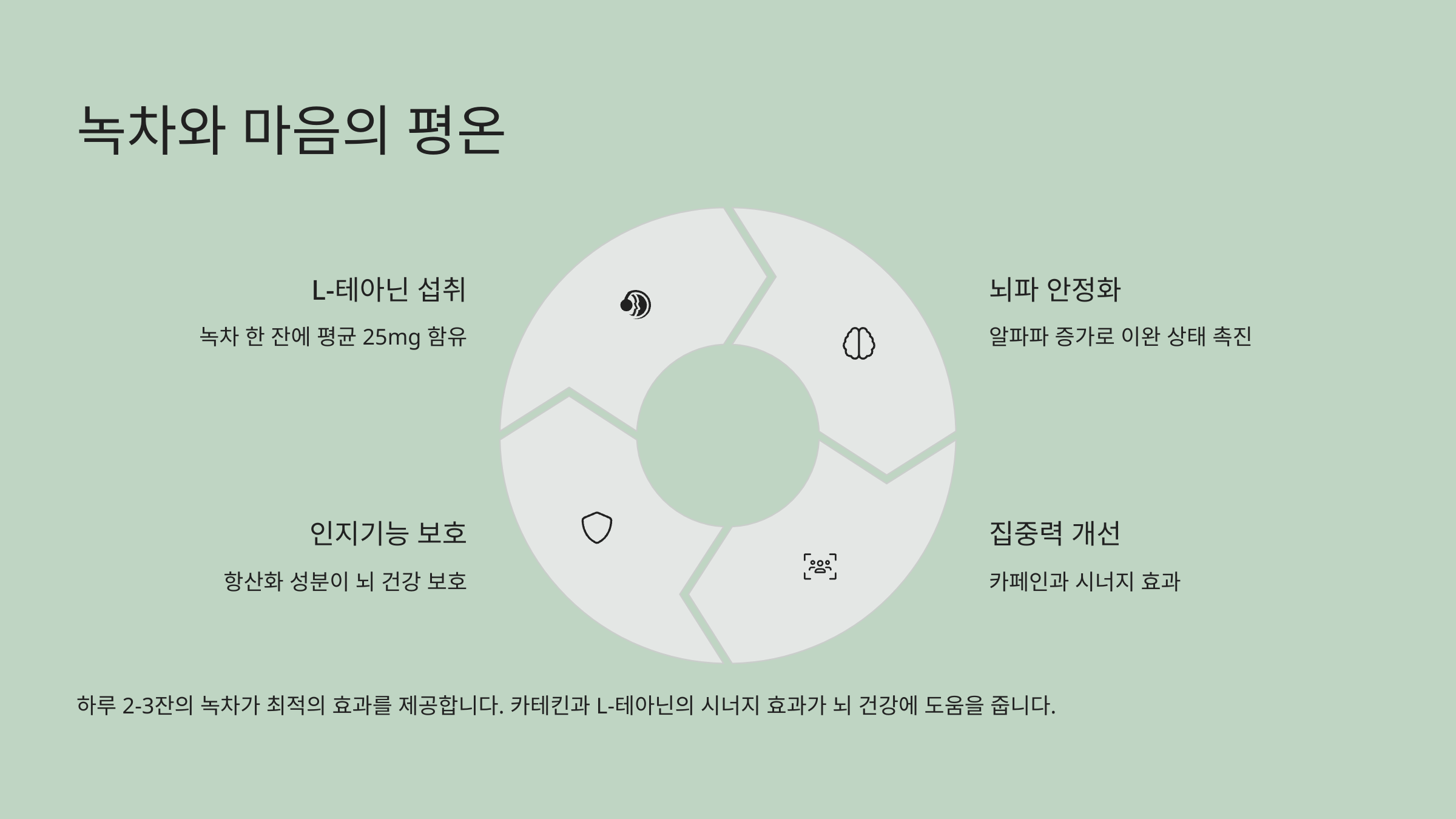 녹차 속에 들어 있는 L-테아닌은 뇌파를 안정시키고 마음을 차분하게 만들어줘요. 특히 카페인이 적당히 섞여 있어서 졸림 없이 집중력을 높여주는 효과까지! 오후에 녹차 한 잔, 진짜 추천해요.