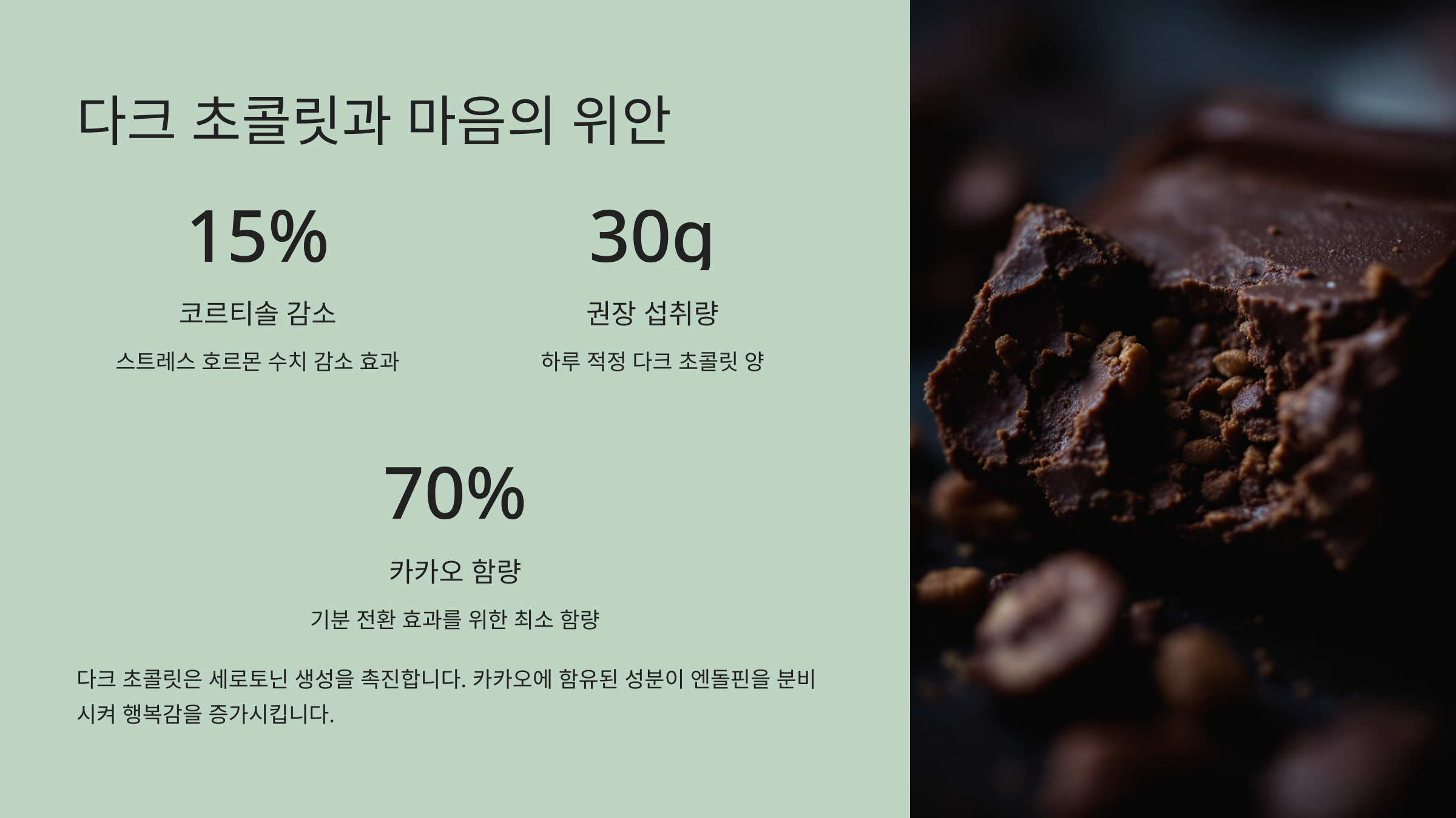 스트레스 받을 때 단 게 당긴다? 그건 우리 몸의 신호일 수도 있어요. 카카오 함량이 높은 다크 초콜릿에는 플라보노이드와 마그네슘, 테오브로민 등이 들어 있어서 스트레스 호르몬인 코르티솔 수치를 낮춰준다고 해요. 하루 한 조각, 생각보다 큰 힘이 될 수 있어요.