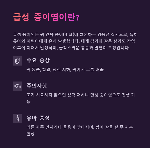급성 중이염은 귀 안쪽에 위치한 중이(中耳)에 염증이 생기는 질환으로, 특히 유아나 어린이에게 흔히 발생합니다. 급작스럽게 통증, 발열, 귀에서 고름이 나는 등의 증상이 나타나며, 대개 감기와 같은 상기도 감염 이후에 이어서 발생합니다. 이 질환은 조기 치료 시 큰 문제 없이 회복되지만, 치료가 지연되면 청력 저하나 만성 중이염으로 진행될 수 있어 주의가 필요합니다.
