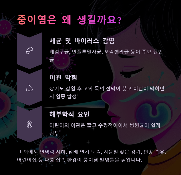 📌 감염은 대부분 이관을 통해 중이로 전파됩니다. 이관은 어린이에게서 짧고 수평적이기 때문에 병원균이 쉽게 침투할 수 있는 구조입니다. 그 외에도 다음과 같은 요인이 급성 중이염을 유발할 수 있습니다: