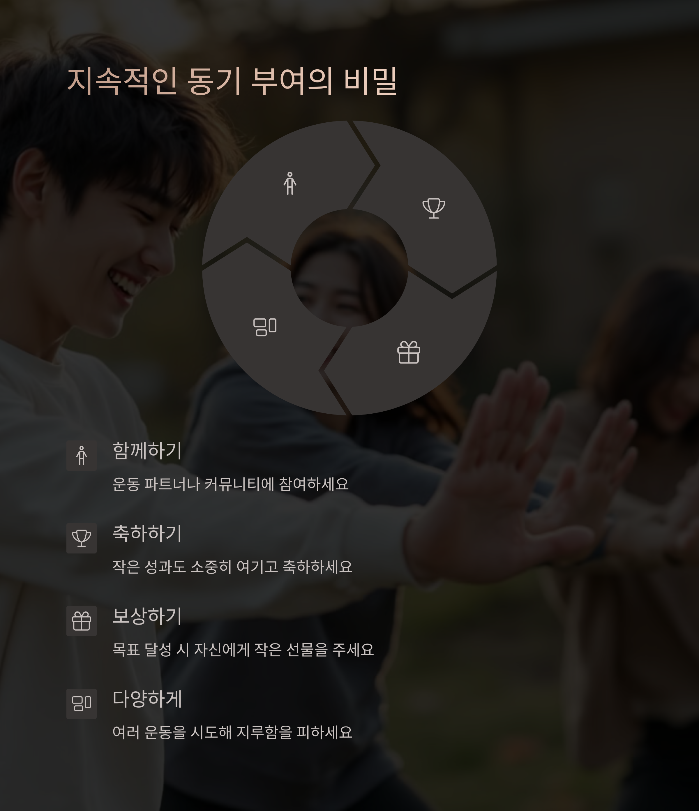 목표를 시각화하거나, 친구와 함께 운동하거나, 운동 전후 변화를 기록해보세요. 간단한 보상을 설정하는 것도 도움이 됩니다.