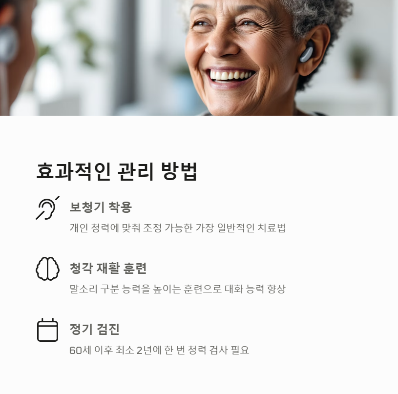 노인성 난청은 완전히 치료하기 어렵지만, 다음과 같은 방법으로 효과적으로 관리할 수 있습니다.