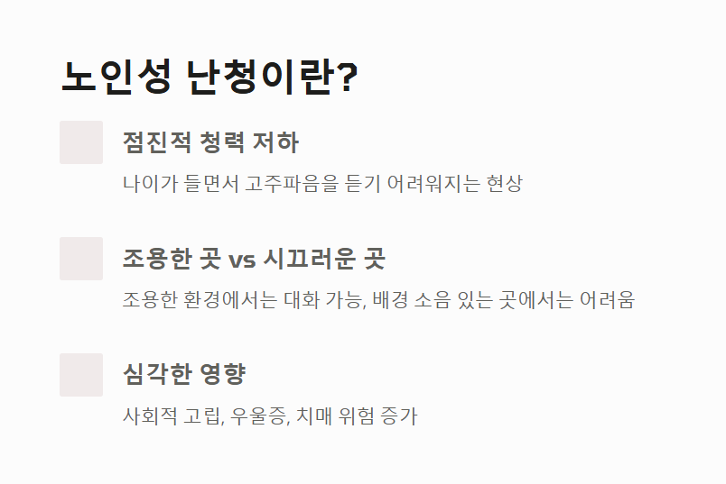 청력 저하는 단순한 불편을 넘어서 사회적 고립, 우울증, 치매와 같은 심리적 문제까지 유발할 수 있기 때문에 조기 발견과 관리가 매우 중요합니다【출처: WHO, Age-related hearing loss】.