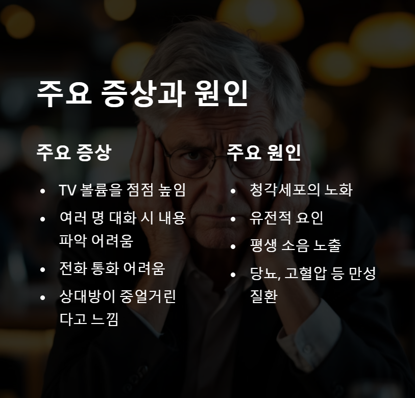 • 청각세포의 노화: 귀 속 달팽이관의 청각세포가 손상되면서 고주파 소리를 인식하는 능력이 저하됩니다.