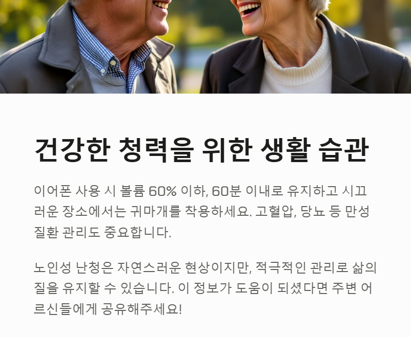 노인성 난청은 누구나 겪을 수 있는 자연스러운 현상이지만, 방치하면 삶의 질이 크게 저하될 수 있습니다. 지금 이 글을 읽고 계신 여러분이나 주변 어르신들에게 필요한 정보라면, 함께 공유해보세요. 여러분의 작은 관심이 누군가에겐 큰 도움이 될 수 있습니다 😊