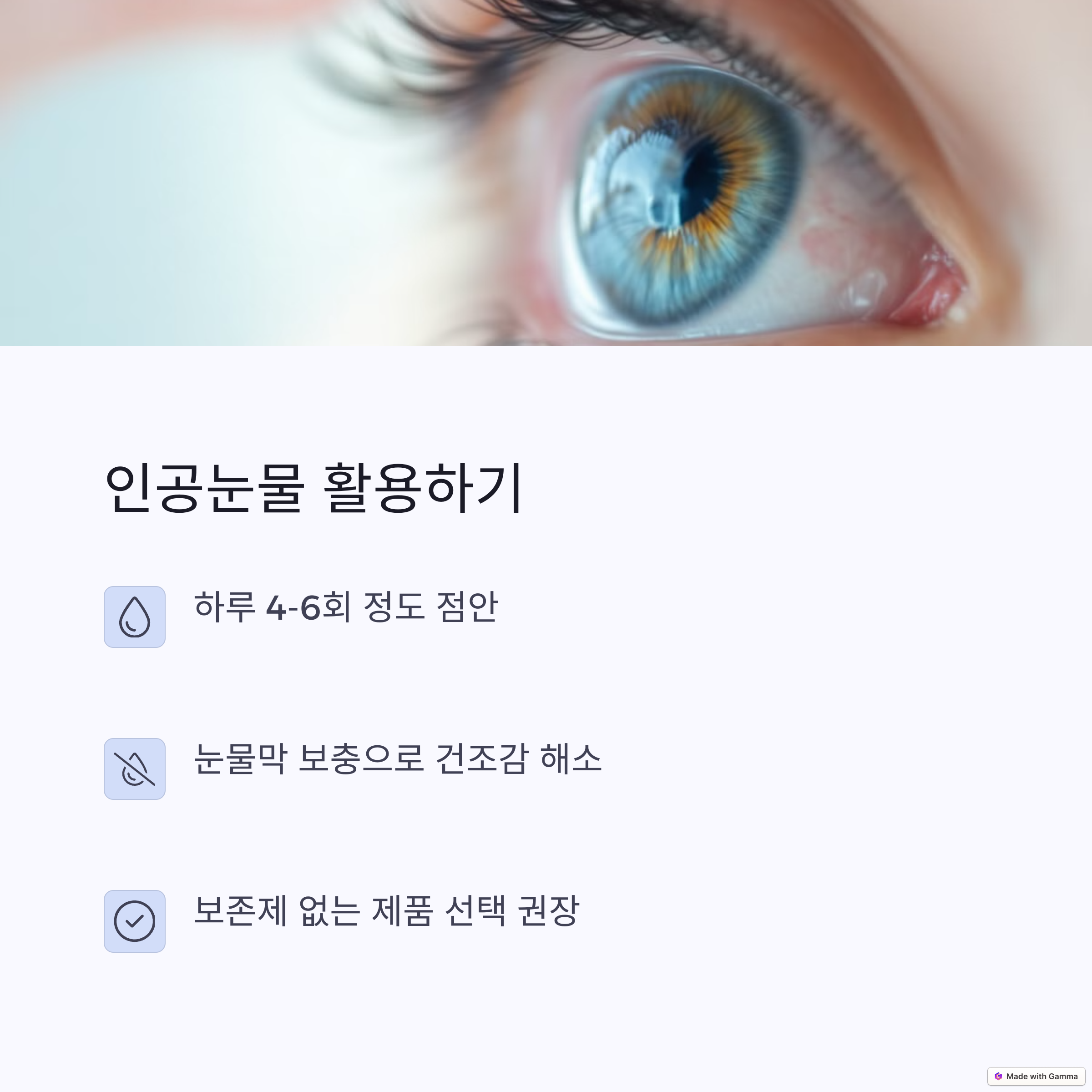 | 인공눈물 사용 | 건조한 눈을 보호하기 위해 하루 2~3회 사용합니다. |