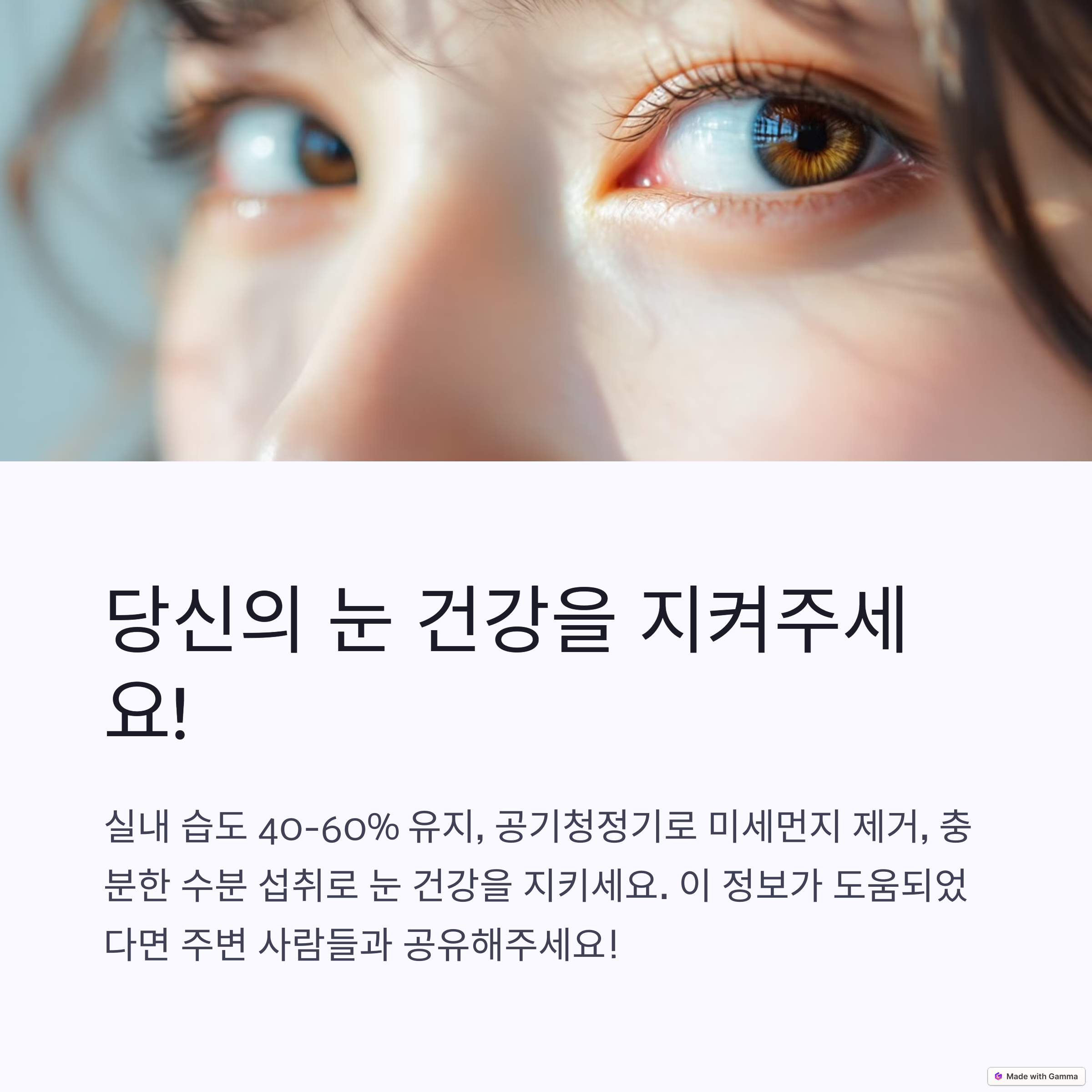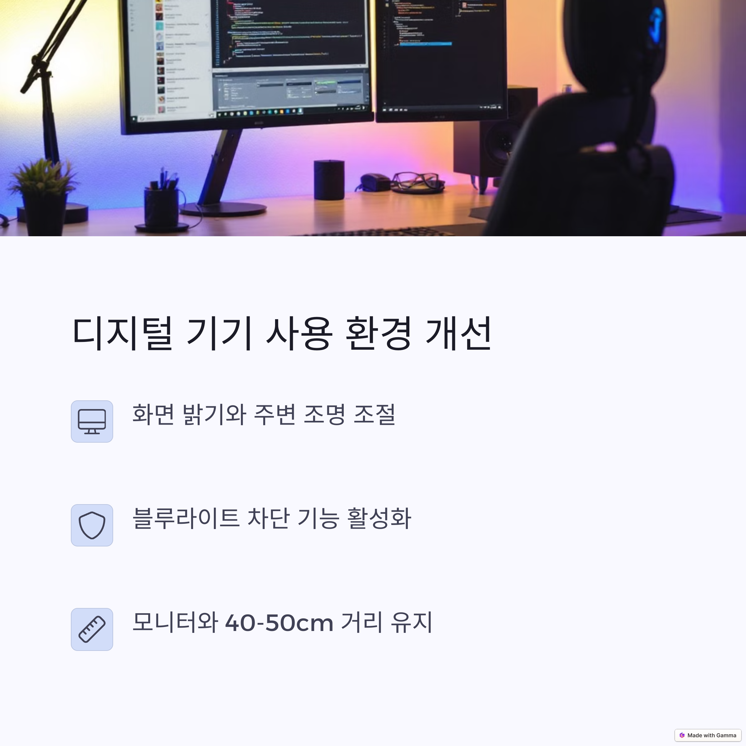 | 20-20-20 규칙, 눈 스트레칭 실천 | 인공눈물, 실내 습도 조절, 온찜질 활용 | 매일 반복하여 습관으로 만들기 |