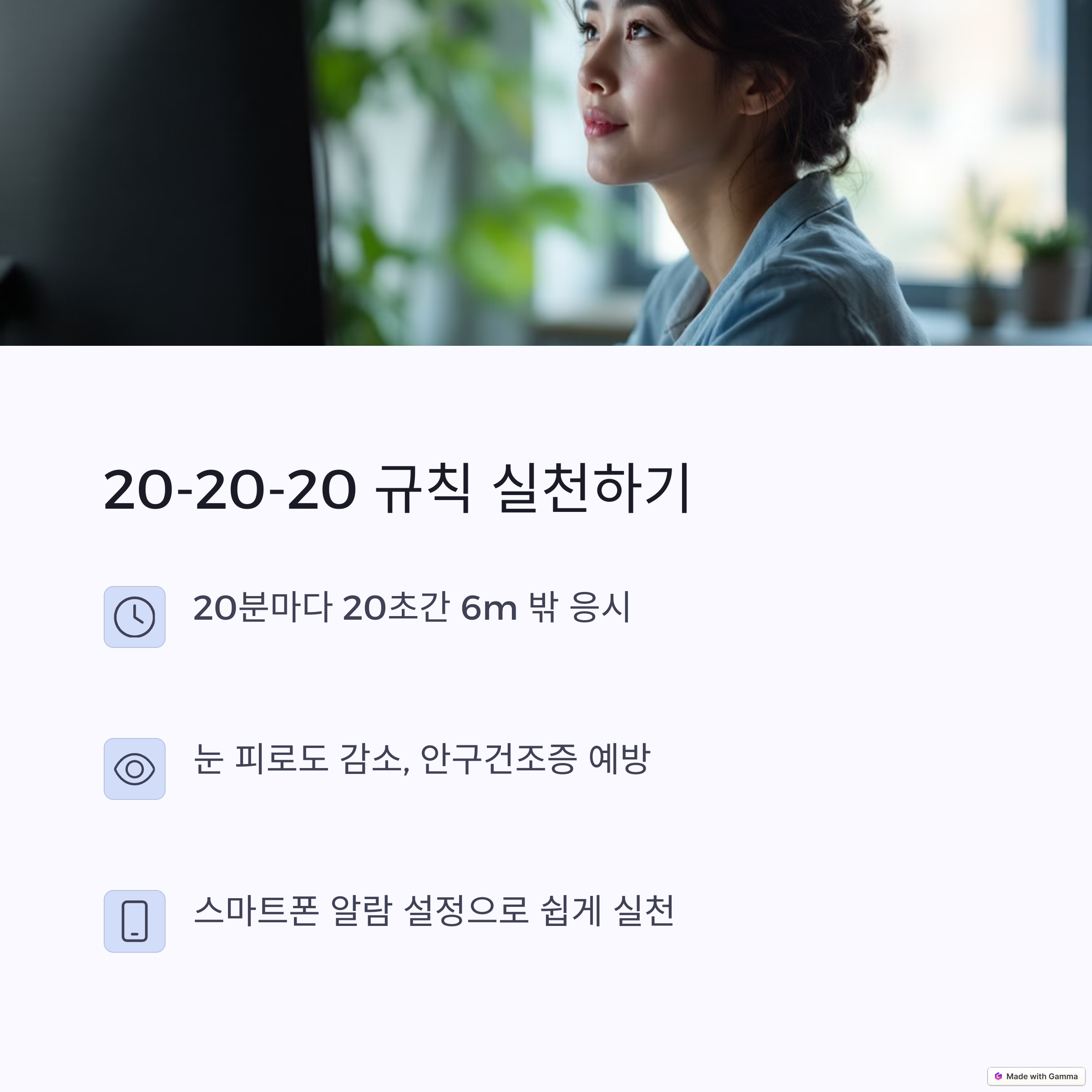 | 깜빡임 자주 하기, 화면 거리 조절 | 수분 섭취로 안구 수분 유지 | 일정 알람 설정으로 실천 유도 |
