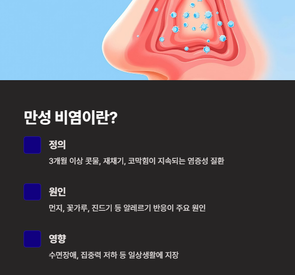 비염은 콧물, 재채기, 코막힘 같은 증상이 반복적으로 나타나는 코의 염증성 질환입니다. 그 중 만성 비염은 이런 증상이 3개월 이상 지속되며 일상생활에 영향을 줄 정도로 심한 경우를 말합니다. 일반적으로 알레르기성 비염비알레르기성 비염으로 나뉘며, 대부분 먼지, 꽃가루, 진드기 등의 알레르기 반응이 주요 원인입니다.