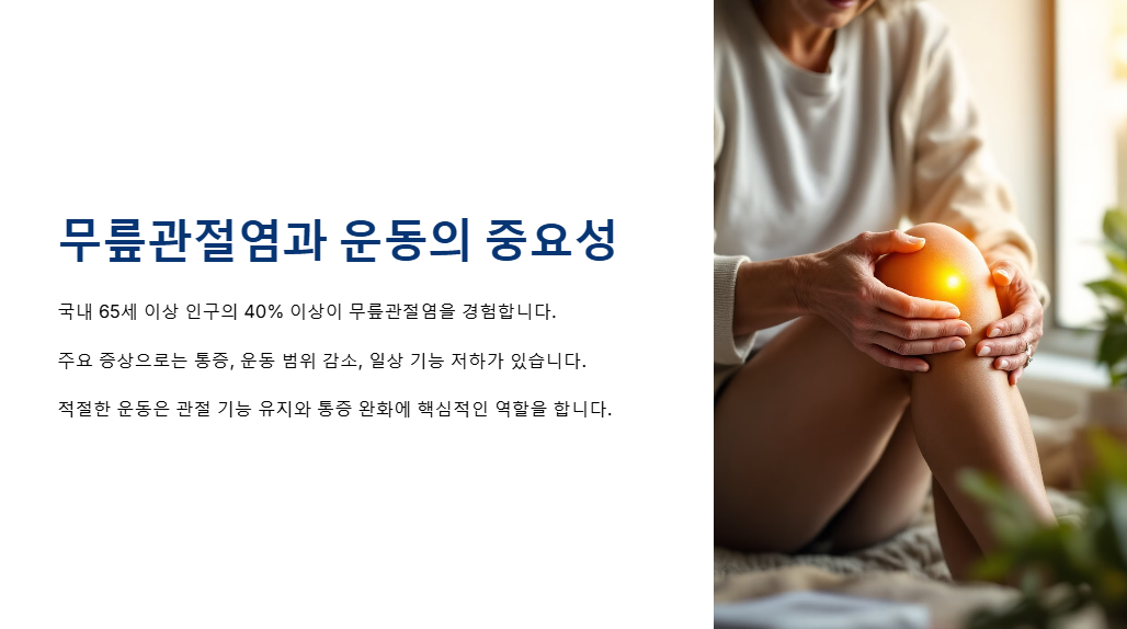 안녕하세요, 여러분! 무릎이 시큰거리거나 걷는 게 힘들어질 때, 많은 분들이 운동을 피하게 되죠. 저도 한때는 '움직이면 더 아프겠지'라는 생각으로 무릎을 아꼈지만, 결과적으로 더 경직되고 불편해졌어요. 무릎관절염은 연골이 닳는 퇴행성 질환이지만, 적절한 운동만큼 효과적인 치료법은 없다는 거, 알고 계셨나요? 오늘은 관절을 지키면서도 실천 가능한 운동법들을 자세히 알려드릴게요. 무릎이 편안해지는 날까지, 함께 시작해봐요!