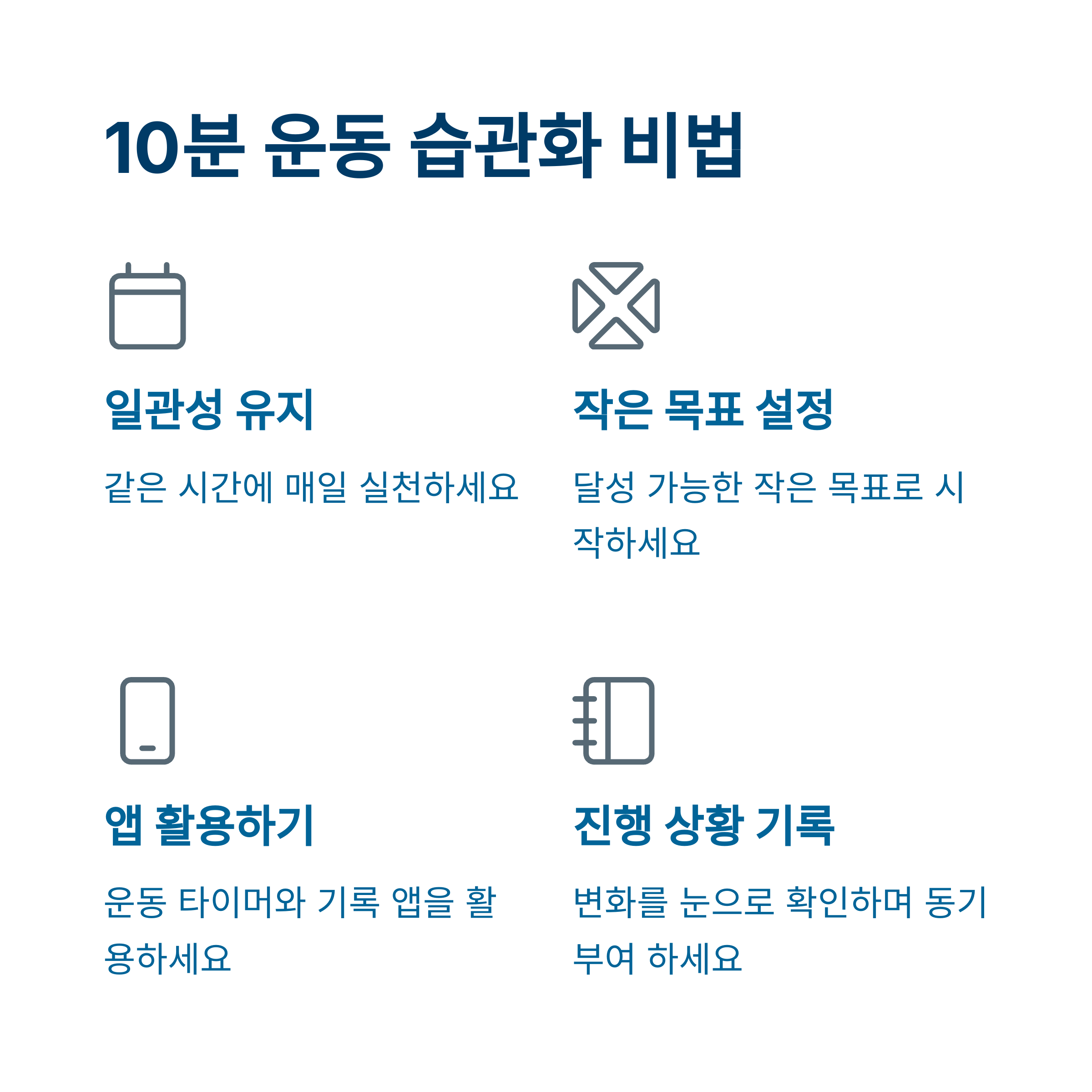 10분 루틴도 꾸준히 하지 않으면 효과를 보기 힘들어요. 그래서 습관처럼 만드는 게 핵심입니다. 저는 아침 양치 후 자동으로 매트를 펴는 루틴을 만들었더니 어느새 몸이 기억하더라고요.