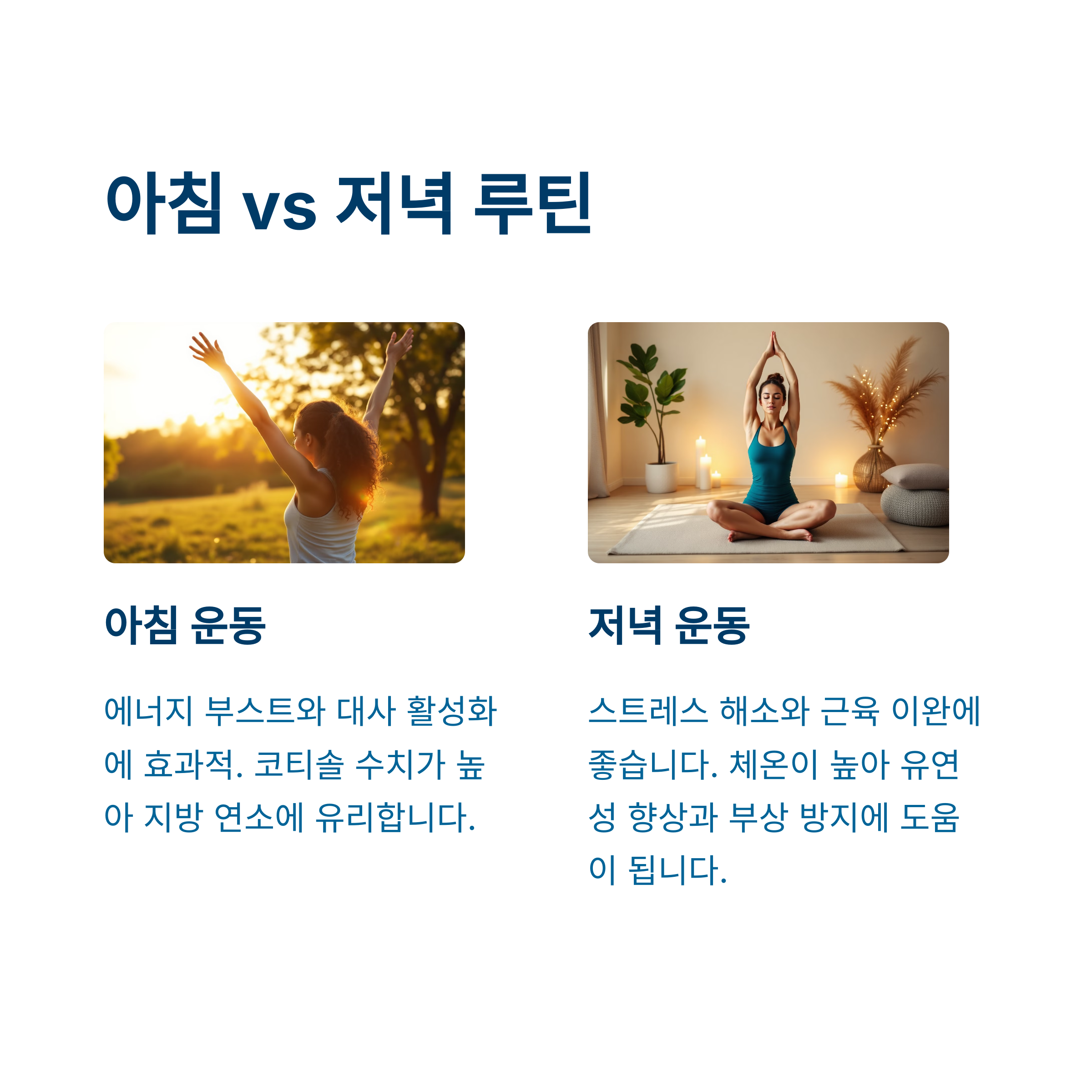개인 차이가 있지만 아침 운동은 활력 있는 하루 시작에, 저녁 운동은 스트레스 해소와 수면 향상에 적합해요. 라이프스타일에 맞게 선택하세요.