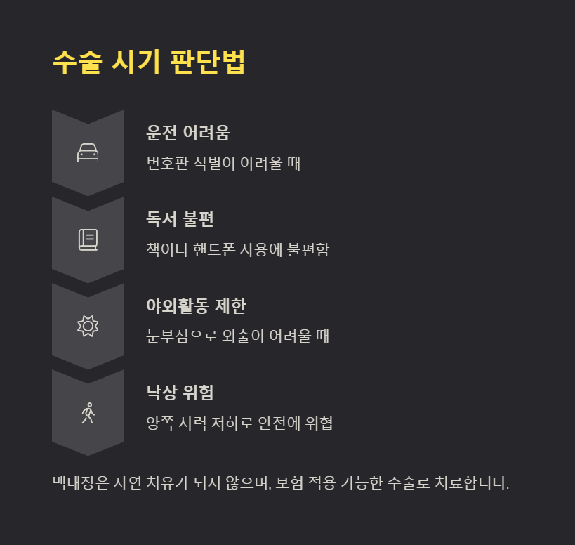 백내장은 자연 치유가 되지 않기 때문에, 생활에 불편을 줄 정도로 시력이 저하되면 수술을 고려해야 합니다. 특히 다음과 같은 경우라면 수술이 권장됩니다: