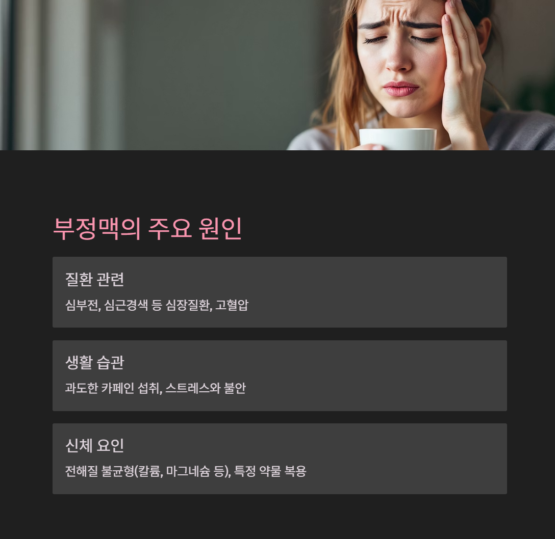 부정맥은 다양한 요인으로 발생할 수 있어요. 대표적으로는 다음과 같은 것들이 있습니다: