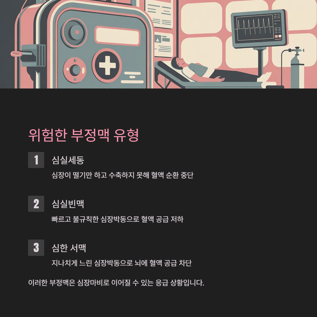 이런 부정맥은 응급 상황이며, 신속한 CPR이나 제세동이 생명을 좌우할 수 있습니다.