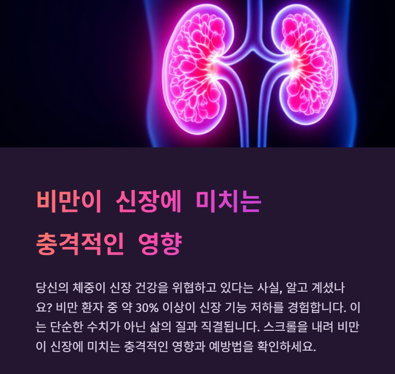 신장은 우리 몸의 숨은 주인공입니다. 비만이라는 적을 이겨내는 작은 노력이, 이 소중한 장기를 지키는 큰 힘이 됩니다. 지금 당장은 느껴지지 않더라도, 당신의 선택이 미래의 건강을 바꾸게 될 것입니다. 건강은 미리 챙기는 습관에서 시작됩니다.