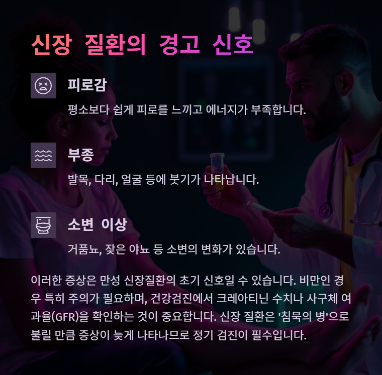 혹시 체중이 늘고 피로함이 심해지셨나요? 지금 바로 건강검진을 통해 신장 상태를 확인해보세요. 건강한 습관 하나가 평생을 지켜줄 수 있습니다. 이 글이 도움이 되셨다면 가족이나 친구와도 꼭 공유해주세요!
