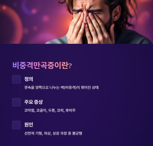 비중격만곡증은 생각보다 다양한 증상을 동반합니다. 대표적인 증상은 다음과 같습니다: