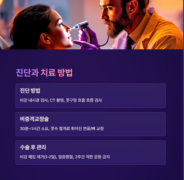비중격만곡증은 수술만이 근본적인 치료 방법입니다. 약물로 일시적 완화는 가능하지만, 구조적 문제 해결은 어렵습니다. 대표적인 수술은 비중격교정술(Septoplasty)입니다.