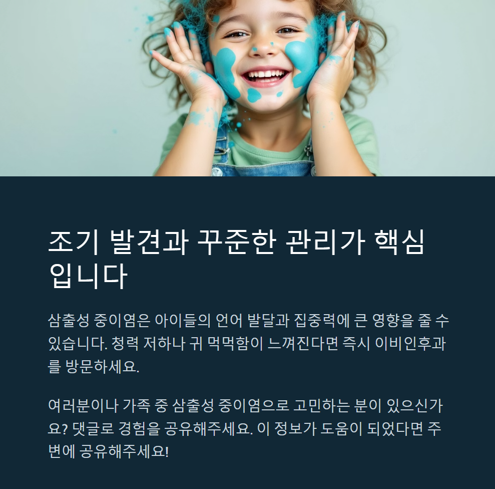 삼출성 중이염은 아이들의 언어 발달과 집중력에 큰 영향을 줄 수 있는 질환입니다. 통증이 없다고 방심하지 말고, 청력 저하나 귀 먹먹함이 느껴진다면 이비인후과를 찾아 정밀 검사를 받아야 합니다. 조기 발견과 치료가 이루어지면 대부분 후유증 없이 회복이 가능합니다. 무엇보다 꾸준한 관심과 관리가 중요하다는 점을 꼭 기억하세요!