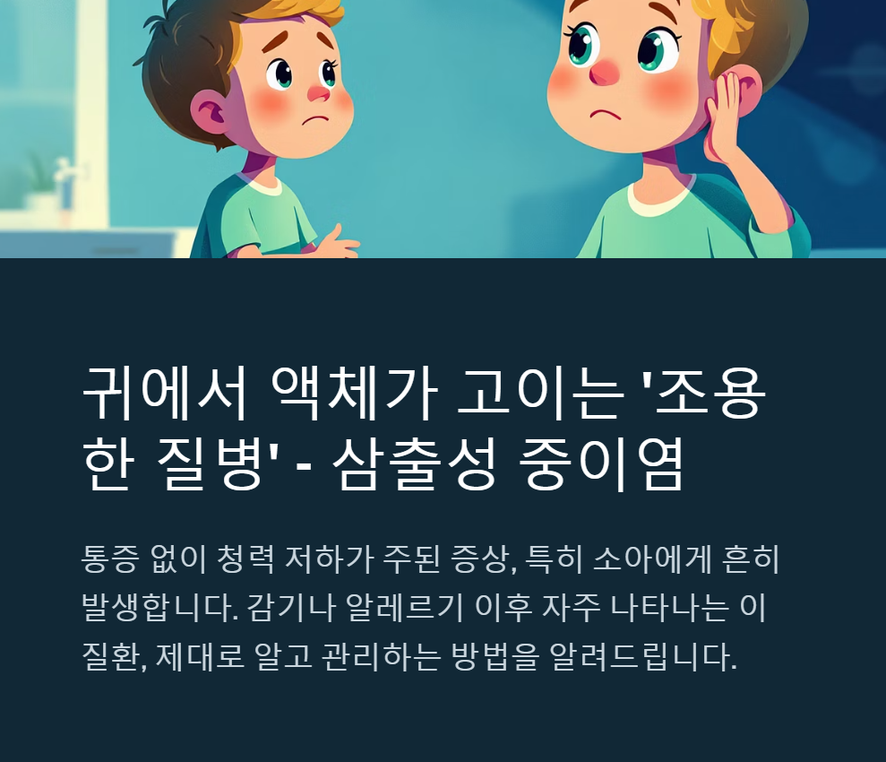 삼출성 중이염은 중이에 액체가 고이는 질환으로, 통증 없이 청력 저하가 주된 증상입니다. 특히 소아에게 흔히 발생하며, 감기나 알레르기 이후에 자주 나타납니다. 급성 중이염과 달리 고름이나 발열 없이 조용히 진행되기 때문에 '조용한 질병'으로 불리기도 합니다. 조기 진단과 적절한 치료가 중요합니다.
