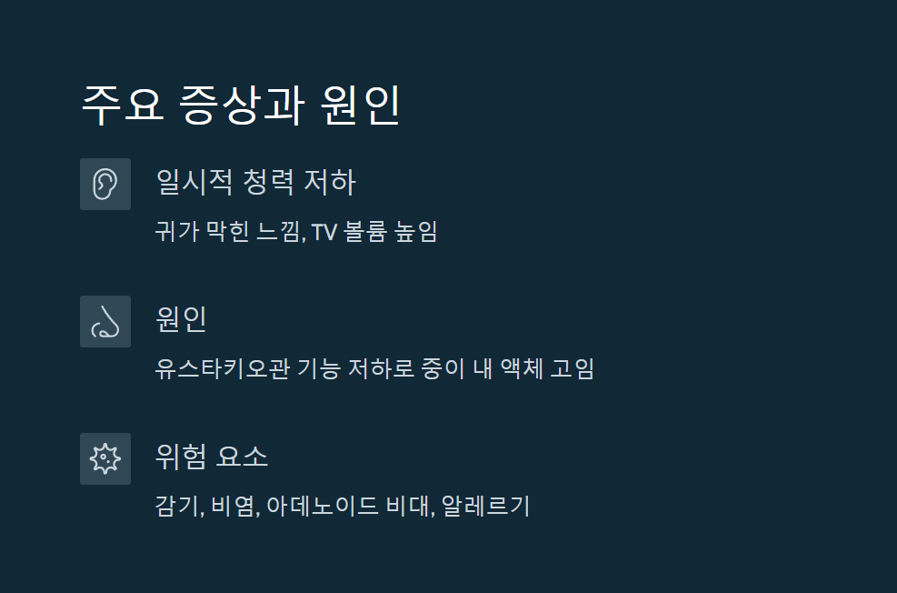원인은 주로 유스타키오관 기능 저하로 인해 중이 내부의 압력이 조절되지 않으면서 액체가 고이는 것입니다. 감기, 비염, 아데노이드 비대, 알레르기 등이 위험 요소입니다【출처: 서울대학교병원 의학정보】.