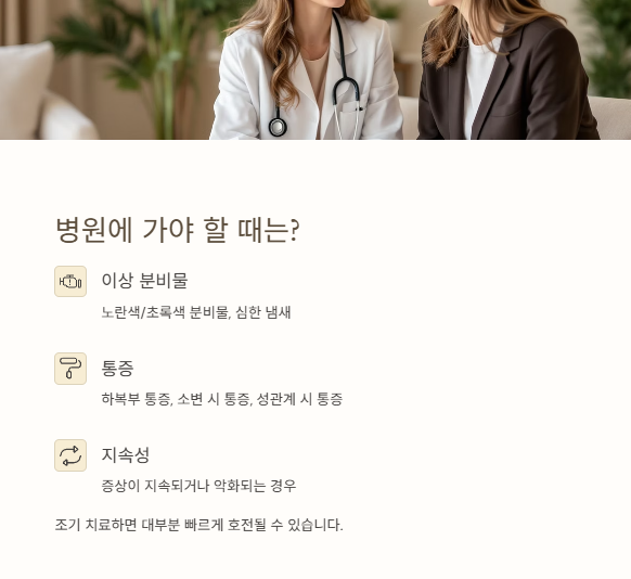 이러한 증상이 지속되거나 악화된다면 산부인과 진료를 서두르는 것이 중요합니다. 조기에 치료하면 대부분 빠르게 호전될 수 있으니까요.