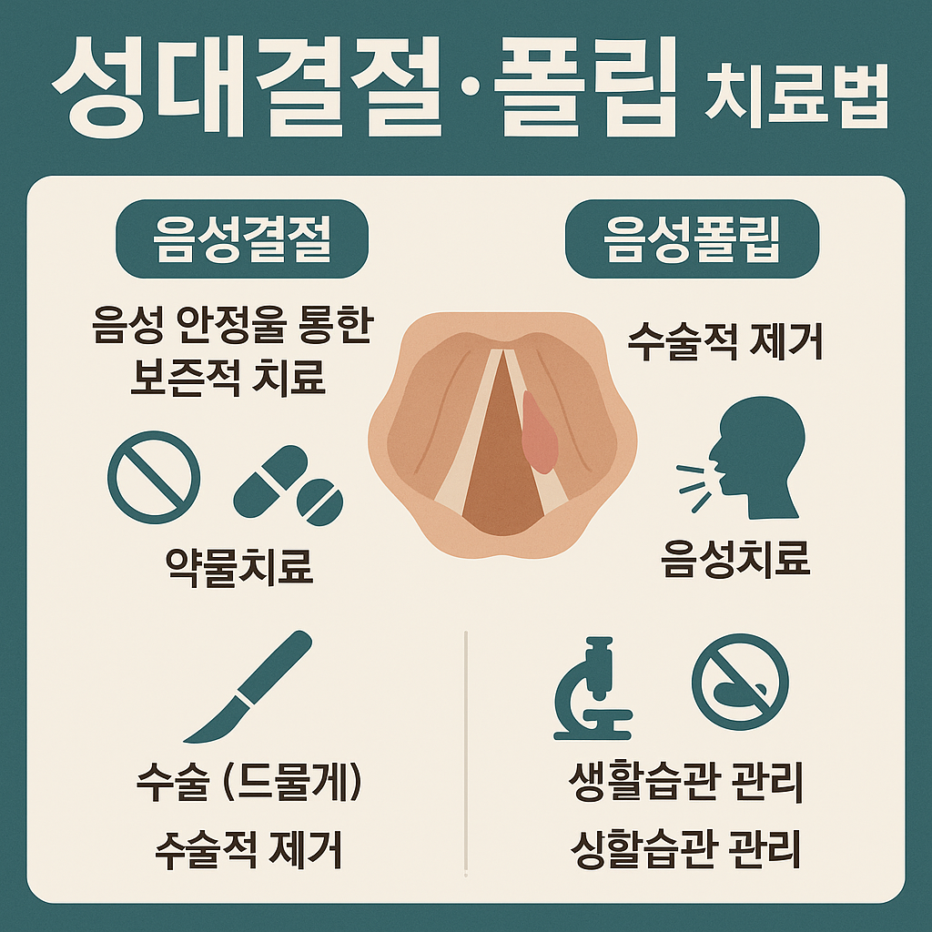 - 수술 치료: 경우에 따라 수술이 필요할 수 있습니다. 특히 폴립의 경우, 크기가 크거나 증상이 심각할 때 수술로 제거하는 것을 고려할 수 있습니다.