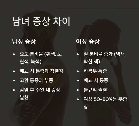 가장 큰 차이점은 남성은 뚜렷하고 빠른 증상, 여성은 경미하거나 무증상이라는 점입니다. 여성의 경우 질 내부 구조가 복잡하고, 증상이 다른 질환과 유사하기 때문에 감염 사실을 모른 채 방치되기 쉽죠. 이로 인해 남성보다 치료 시기를 놓치거나 합병증으로 진행되는 경우가 더 많습니다.