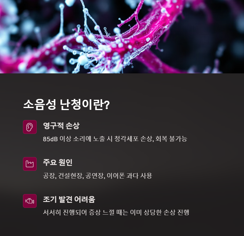 소음성 난청은 주로 지속적이거나 갑작스러운 큰 소리에 귀가 노출되었을 때 발생하는 청력 손실입니다. 특히 85dB 이상의 소리에 장기간 노출될 경우 귀 안의 청각세포가 손상되며, 이는 회복이 불가능한 영구적인 청력 손실로 이어질 수 있습니다. 주로 공장, 건설현장, 공연장, 이어폰 과다 사용 등이 주요 원인으로 꼽힙니다. 이 질환은 서서히 진행되기 때문에 조기 발견이 어렵고, 증상을 느꼈을 때는 이미 상당한 손상이 진행된 경우가 많습니다【출처: 질병관리청】.