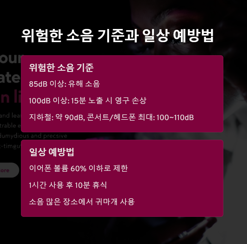 특히 요즘은 소음에 대한 인식이 부족해 헤드폰이나 이어폰을 고음량으로 사용하는 경우가 많습니다. 간단한 습관의 변화만으로도 충분히 예방이 가능합니다.