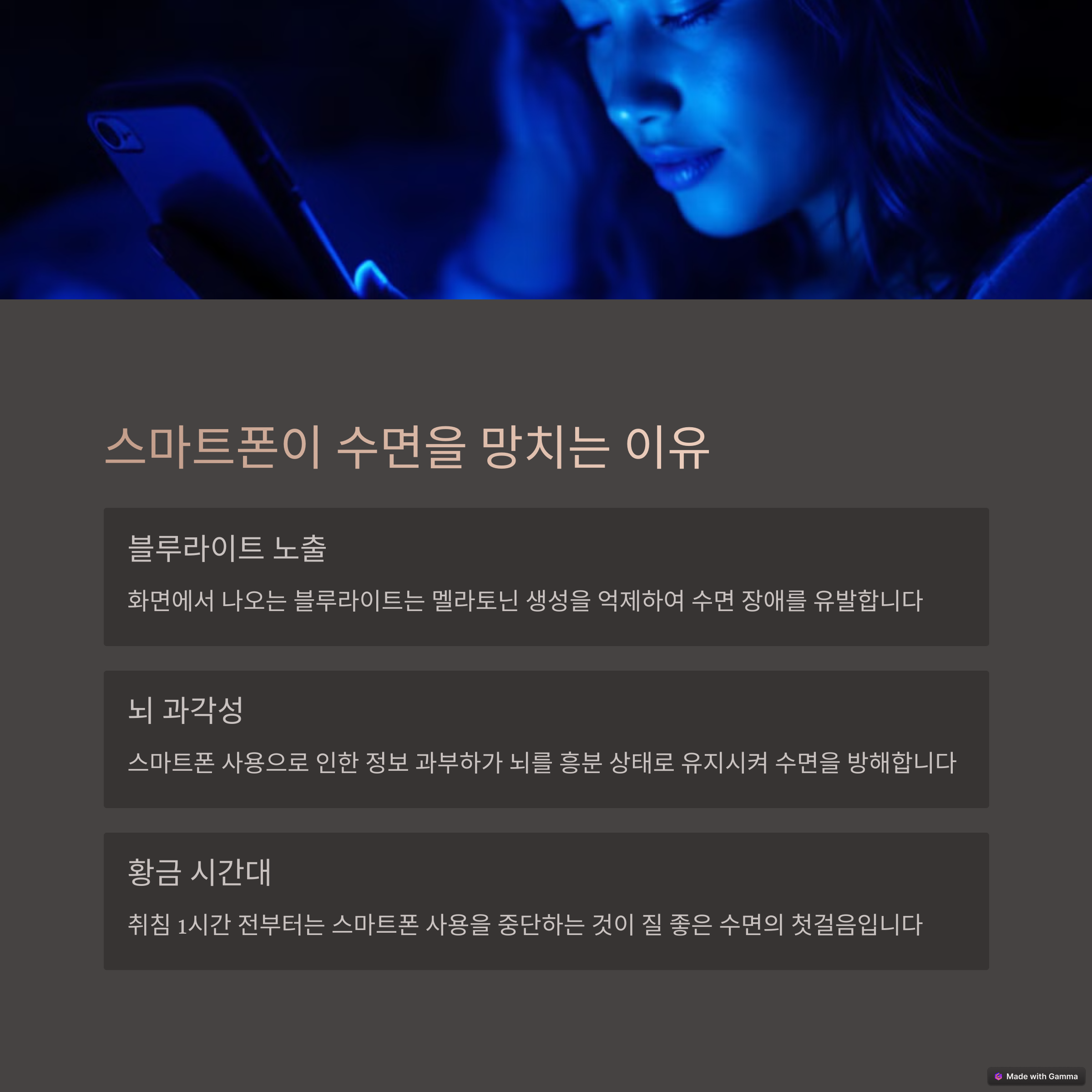 스마트폰에서 나오는 블루라이트는 멜라토닌 분비를 억제해 수면 시작을 지연시키고 수면의 질을 떨어뜨릴 수 있습니다.