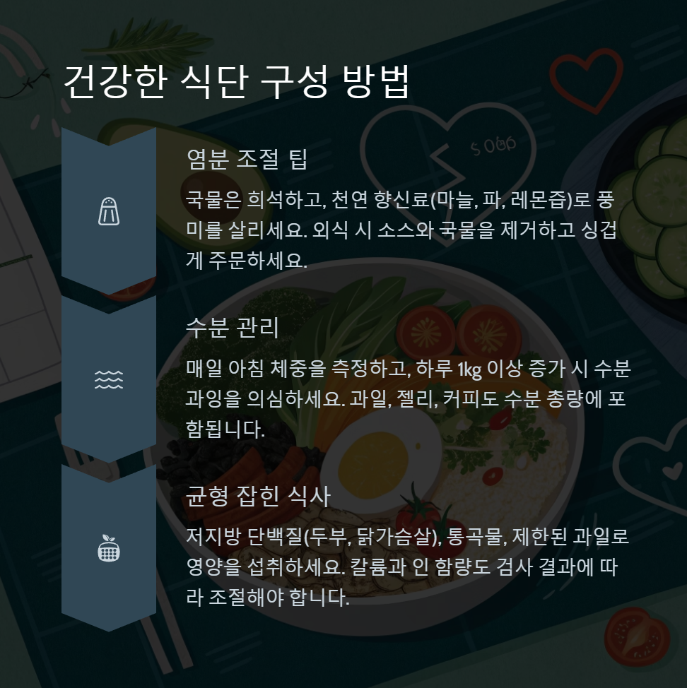 과도한 염분 섭취는 체액 저류와 부종을 악화시키므로 반드시 제한해야 합니다.