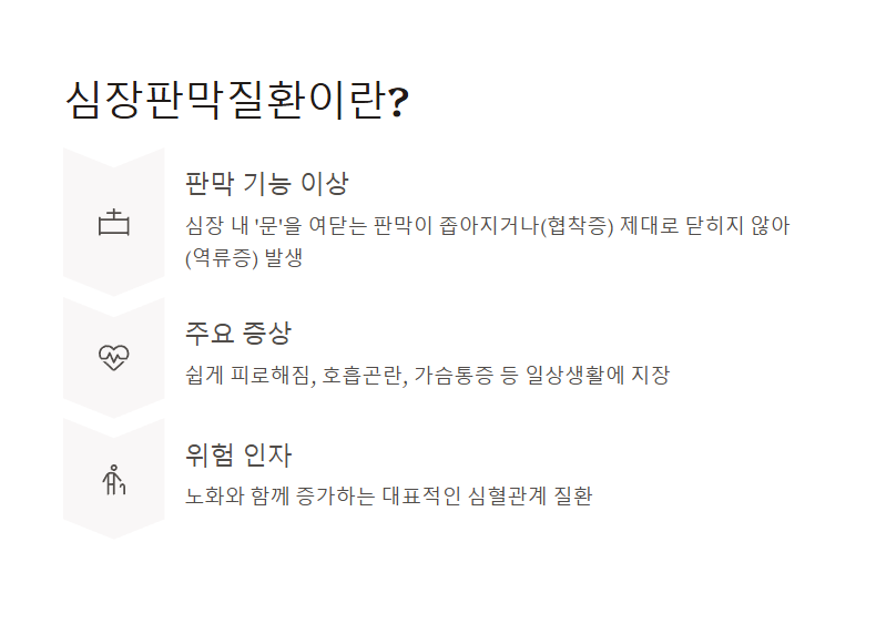 심장판막질환은 심장 내 혈류를 조절하는 판막이 좁아지거나(협착증), 제대로 닫히지 않아(역류증) 혈액의 흐름에 문제가 생기는 질환입니다. 심장이 ‘문을 여닫는 역할’을 제대로 못하게 되는 것이죠. 증상으로는 쉽게 피로해지거나 호흡곤란, 가슴통증 등이 있으며, 노화와 함께 증가하는 대표적인 심혈관계 질환입니다.