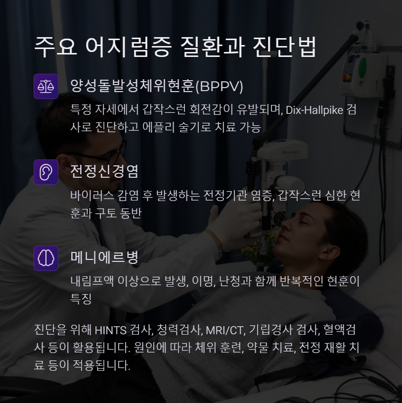 가장 흔한 말초성 질환은 양성돌발성체위현훈(BPPV)입니다. 특정 자세에서 갑작스런 회전감이 유발되며, 에플리(Epley) 술기 등으로 치료가 가능합니다. 전정신경염은 바이러스 감염 후 발생하는 전정기관 염증이며, 갑작스런 심한 현훈과 구토가 동반됩니다. 메니에르병은 내림프액 이상으로 발생하며, 이명, 난청과 함께 반복적인 현훈이 나타나는 것이 특징입니다.