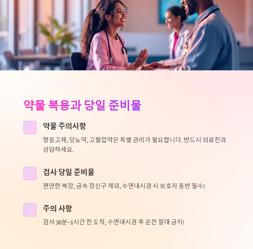 - 검사 당일 아침: 절대 금식이며 물도 제한됩니다(의사 지시 따름).