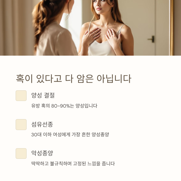 - 유방암: 악성 종양. 조기 발견 시 90% 이상 완치 가능.
