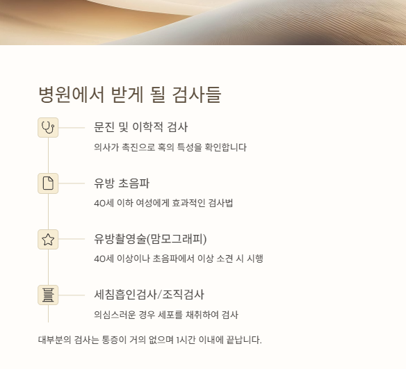 유방 관련 혹이 있을 경우, 병원에서는 다음과 같은 절차를 거칩니다: