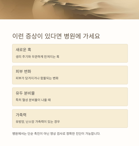 - 새로운 혹이 만져졌을 때 (특히 생리 주기와 무관한 경우)