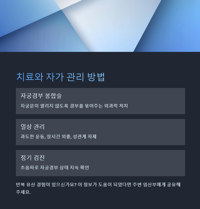 | 추가 조치 | 침상 안정, 질내 감염 예방, 경부 압력 관리 등 |