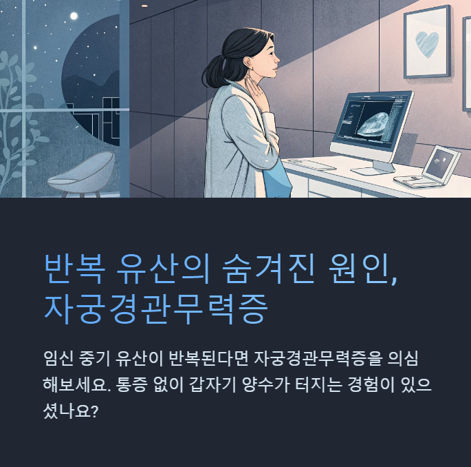 뚜렷한 자각 증상 없이 진행되기 때문에 원인을 모르고 유산을 겪는 여성들에게 가장 간과되기 쉬운 진단 중 하나입니다.