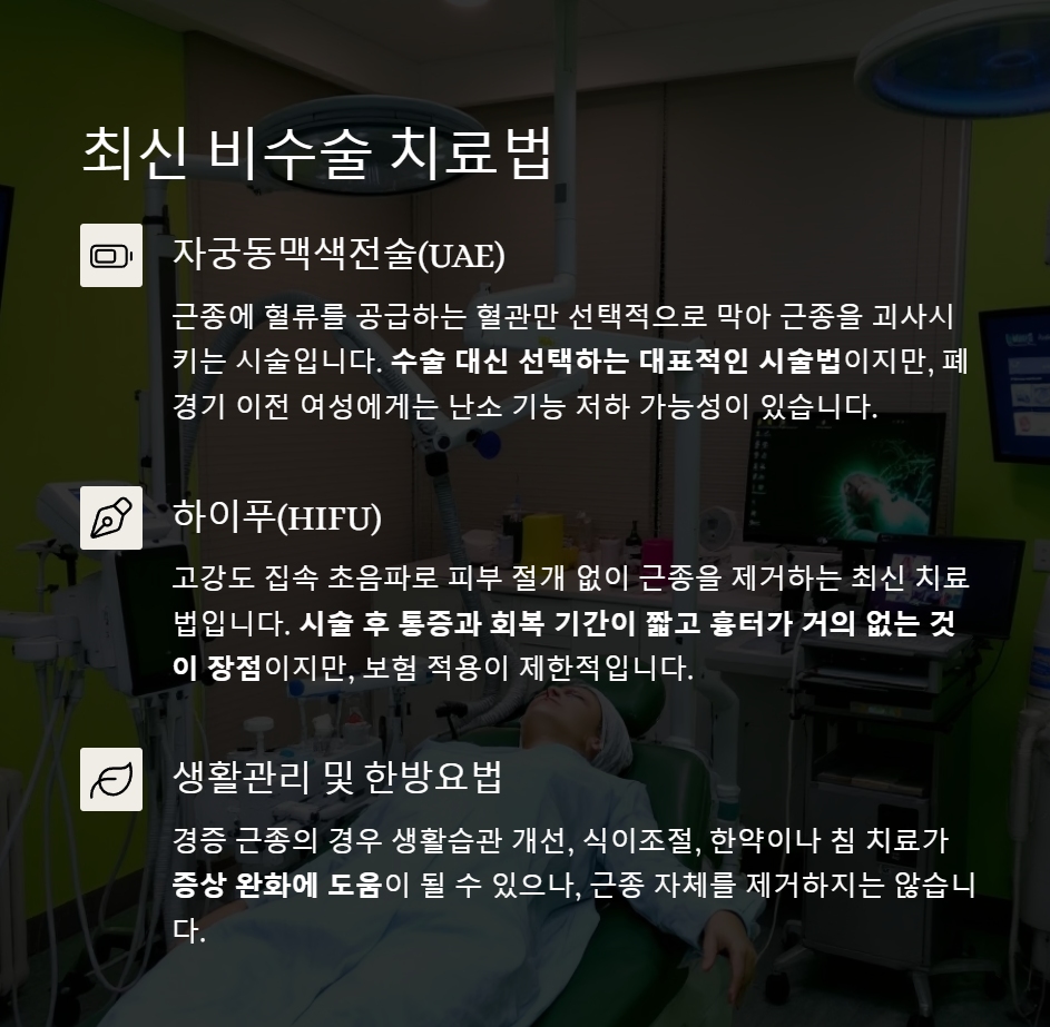| RFA 고주파 | 열로 괴사 | 회복 빠름, 절개 없음 | 단일근종에 적합 |