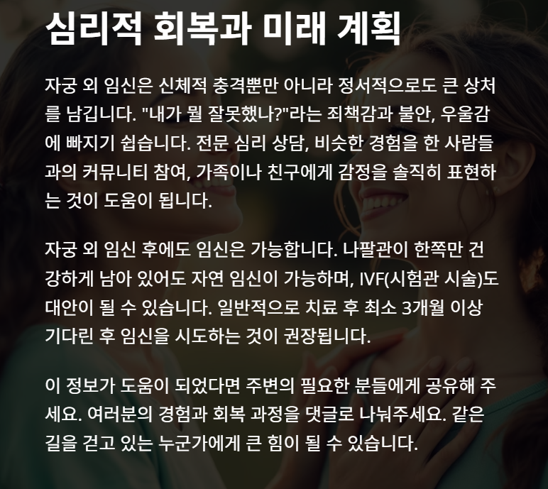 자궁 외 임신은 여성에게 육체적, 정신적으로 큰 시련이지만, 빠른 진단과 적절한 치료, 그리고 지지받는 환경이 있다면 충분히 회복 가능합니다. 중요한 것은 내 몸을 믿고, 나 자신에게 따뜻한 시간을 주는 것입니다.