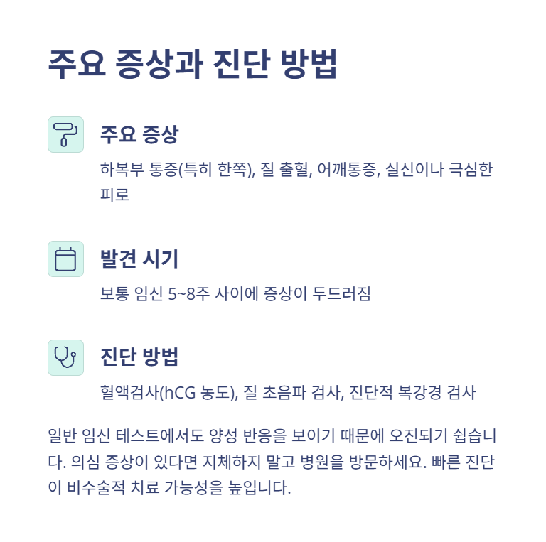 자궁 외 임신은 일반적인 임신 초기 증상을 보이기도 하지만, 복통이나 비정상 출혈을 동반한다면 의심해볼 필요가 있습니다. 특히, 자궁 외 임신을 경험한 여성은 향후 재발 확률도 높기 때문에 주의 깊은 관리와 상담이 필수입니다.